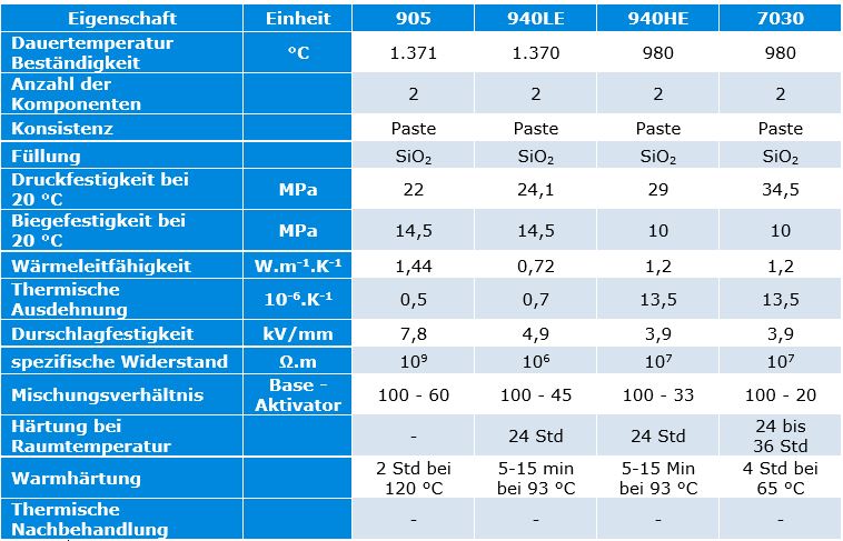 Zweikomponentig, mit hoher Ausdehnung, 980 °C: Klebstoff zum Verkleben und Gießen von Teilen mit sehr hoher Wärmeausdehnung verwendet, zum Beispiel von Heizelementen.