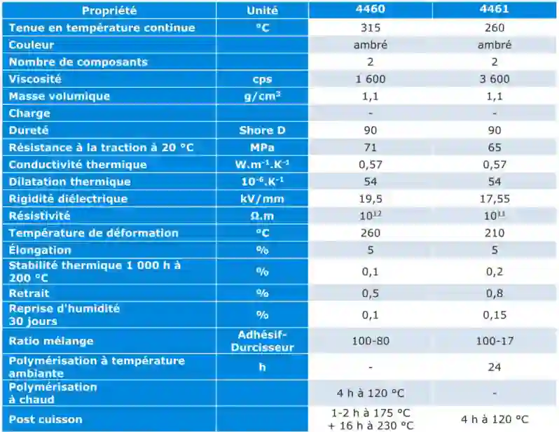Ces produits spéciaux dont la résine époxy haute température de la marque Cotronics® sont spécifiés et fabriqués suivant des méthodes communes dérivées de principes généraux qui induisent leurs ressemblances ; ils se distinguent les uns des autres par :